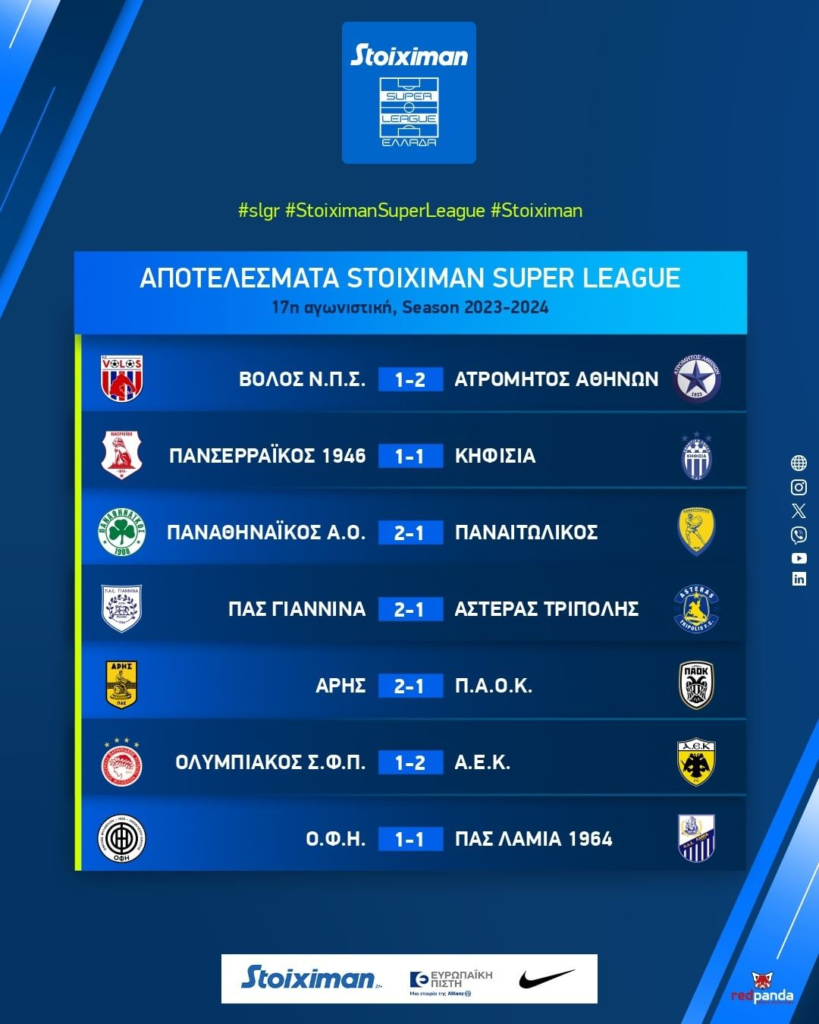 Αποτελέσματα και Βαθμολογία της 17ης Αγωνιστικής της Stoiximan Super League