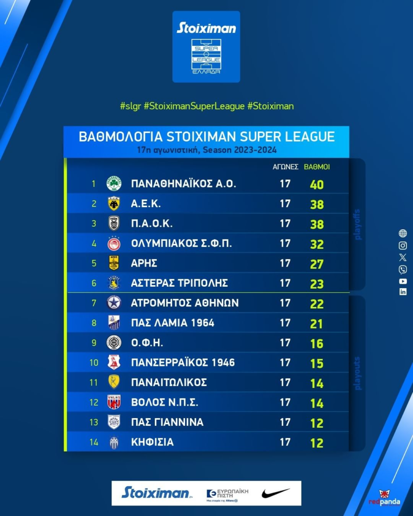 Η 17η αγωνιστική ολοκληρώθηκε με την ισοπαλία ανάμεσα στον ΟΦΗ και τη Λαμία (1-1) στην Κρήτη και με τον Παναθηναϊκό να είναι στην κορυφή πλέον, στο +2 από ΑΕΚ και ΠΑΟΚ.