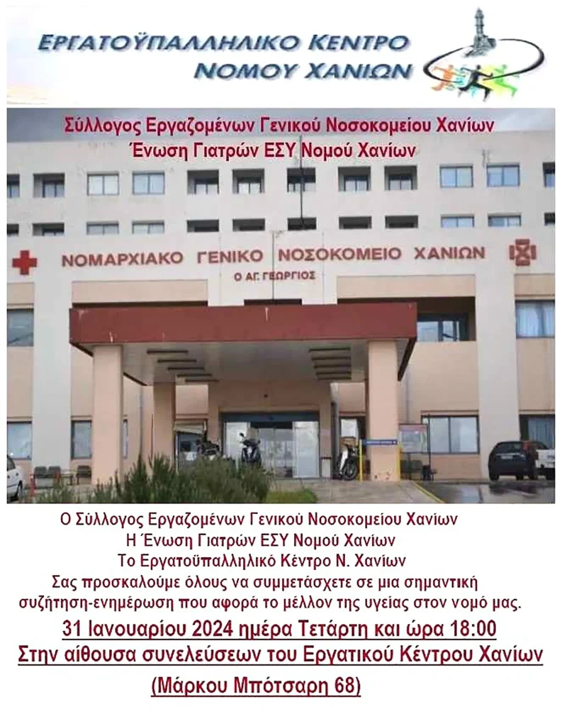 Ο Σύλλογος Εργαζομένων Γενικού Νοσοκομείου Χανίων και η Ένωση Γιατρών ΕΣΥ Νομού Χανίων σε συνεργασία με το Εργατοϋπαλληλικό Κέντρο Ν. Χανίων σας προσκαλούμε όλους να συμμετάσχετε σε μια σημαντική συζήτηση-ενημέρωση που αφορά το μέλλον της υγείας στον νομό μας. Η ενημέρωση θα λάβει χώρα στις 31 Ιανουαρίου 2024 ημέρα Τετάρτη και ώρα 18:00 στην αίθουσα συνελεύσεων του Εργατικού Κέντρου Χανίων (Μάρκου Μπότσαρη 68) και είναι ανοιχτή για όλους.