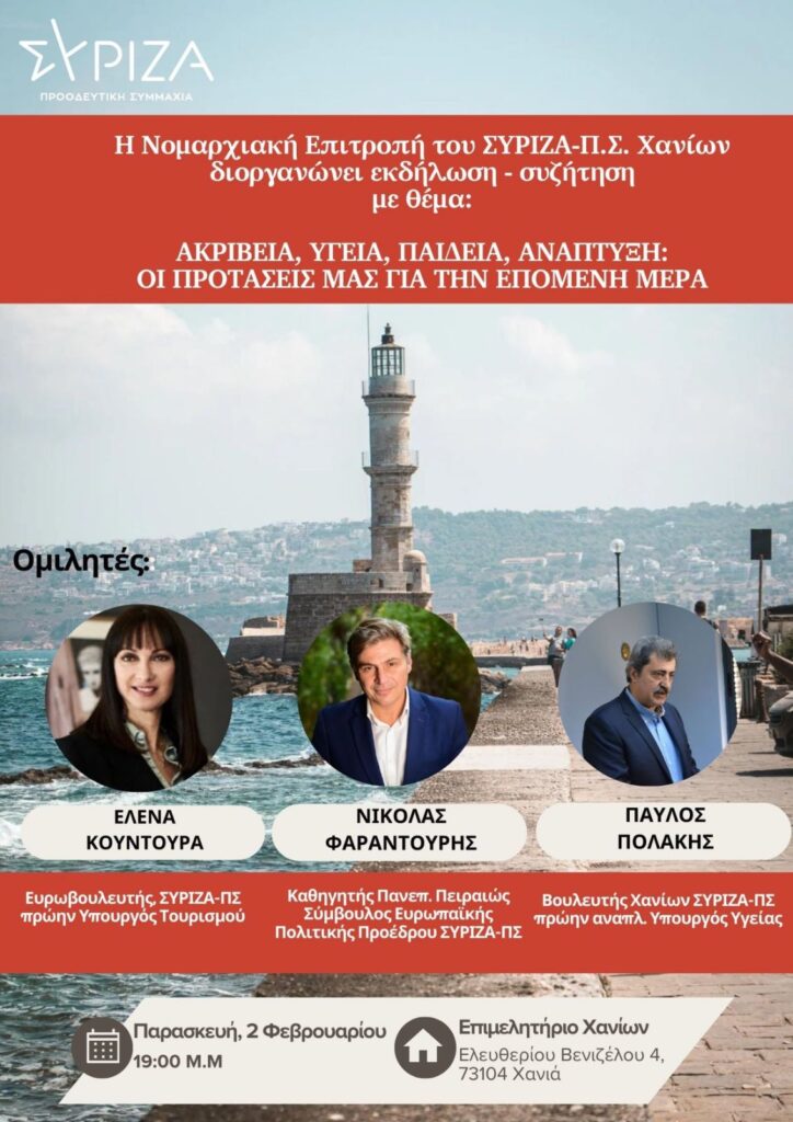 – Η Εκδήλωση από την Ν.Ε του ΣΥΡΙΖΑ-Π.Σ Χανίων στο Επιμελητήριο Χανίων με θέματα Ακρίβεια – Υγεία – Παιδεία – Ανάπτυξη Πολιτισμός Τουρισμός σε συνδυασμό των επισκέψεων στα Χανιά των Βουλευτών και Στελεχών του ΣΥΡΙΖΑ όπου θα συναντηθούν με φορείς του νομού των Χανίων.