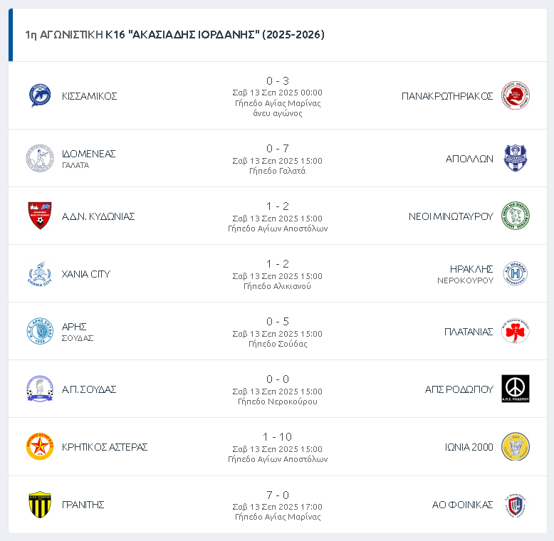 ΕΠΣ ΧΑΝΙΩΝ: Πρωτάθλημα Κ-16 – 1η Αγωνιστική – Αποτελέσματα & Βαθμολογία