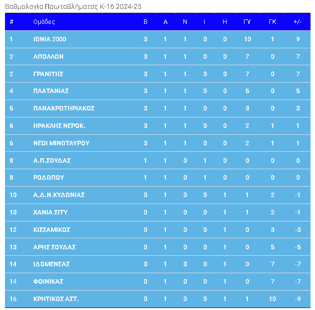 Βαθμολογία Πρωταθλήματος Κ-16 2024-25