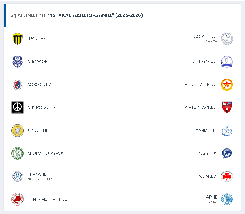 Πρόγραμμα και ορισμοί διαιτητών 2ης Αγωνιστική Κ16 Ακασιάδης Ιορδάνης (2025-2026)