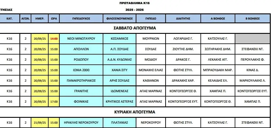 -Ο αγώνας Κ16, Ιωνία 2000-Χανιά Σίτυ, θα διεξαχθεί το Σάββατο 20-9-2025 και ώρα 14:45 στο γήπεδο Νεροκούρου