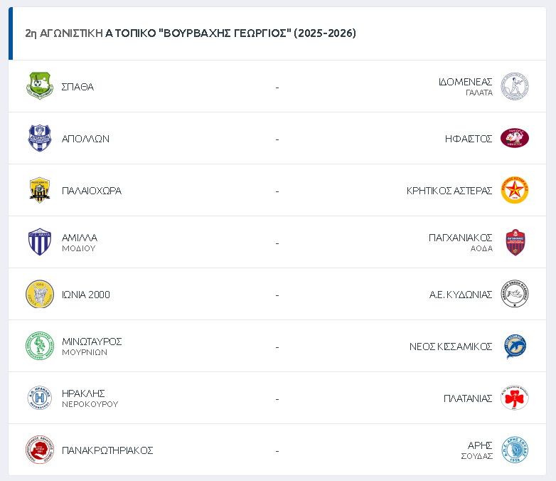 Πρόγραμμα και ορισμοί διαιτητών 2ης Αγωνιστική Α Τοπικό Χανίων Α΄ ΕΠΣΧ “ΒΟΥΡΒΑΧΗΣ ΓΕΩΡΓΙΟΣ” 2025-2026