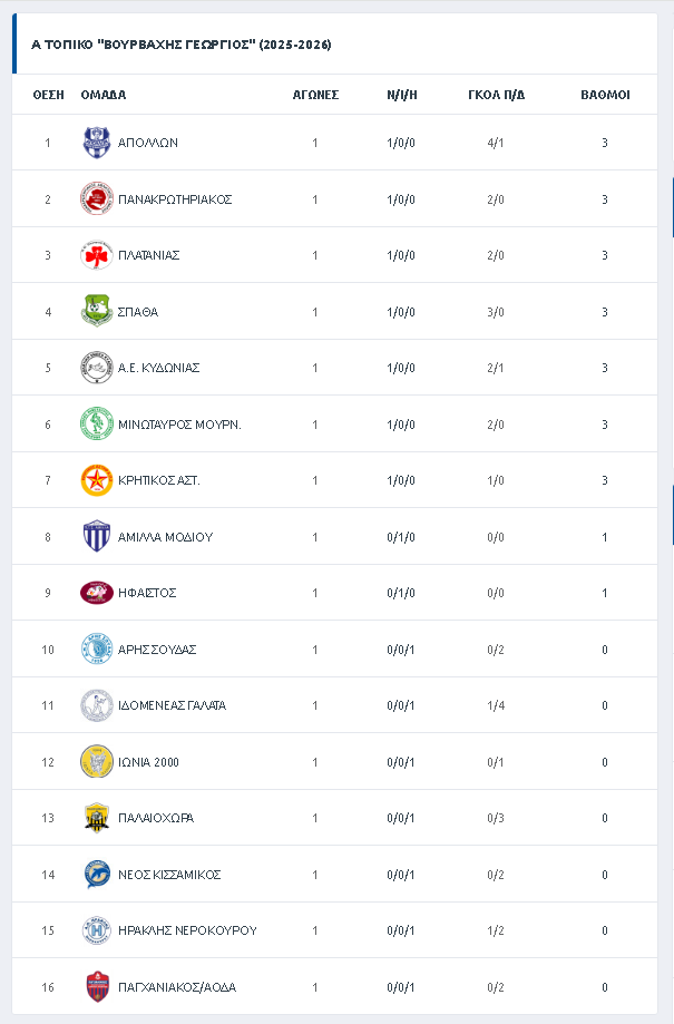 ΒΑΘΜΟΛΟΓΙΑ 1ης ΑΓΩΝΙΣΤΙΚΗΣ Α Τοπικό ΧΑΝΙΩΝ ΒΟΥΡΒΑΧΗΣ ΓΕΩΡΓΙΟΣ (2025-2026)
